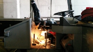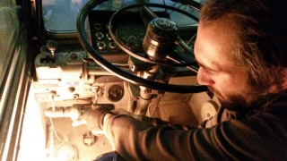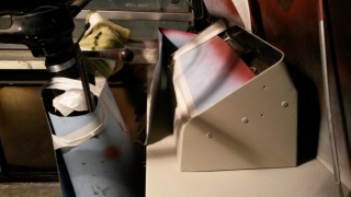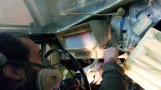 Das Cockpit haben wir überarbeitet. Die Fahrerkabine und noch verbleibende Haltestangen haben wir entfernt. Temporär, um den Arbeiten nicht im Weg zu sein, steht auch der Fahrersitz auf der Ersatzbank neben dem Bus. Das alte Hammerschlag-Grau der Cockpit-Armatur ist einem Seidenmatt-Schwarz gewichen.