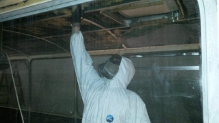 Das Dach ist bereit, neu isoliert zu werden. Die letzten alten Isolationsreste sind bis auf eine Bitumenschicht entfernt. Empfehlungen von Caravan-Ausbauern zufolge sei geschlossen-poriger Schaumstoff die ideale Wahl für eine robuste Isolierung.