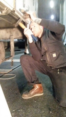 Unterhalb des Holzbodens erstrahlt der Dieseltank in neuem Rostschutz-Grau. Die ausgefressenen Radkappen haben wir mit einem neuen Schutzblech ausgestattet, so dass Innenraum und Aussenraum wieder sauber getrennt sind. Der Hamburger Oldtimer-Umbauer Malte unterstützt uns seit Dezember etwas. Zusammen haben wir den Schaden im Heck-Aussenblechs behoben, sprich ein neues Seitenblech sauber angenietet. Wie wohltuend, wenn die Aussenhülle wieder gänzlich intakt ist.