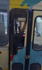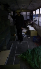 An einzelnen Samstagen und Sonntagen begannen Adrian und Luc mit der Arbeit. Im Sommer darauf das erste Mal einen Monat lang mit Freunden zusammen durchgearbeitet. Rückbau der bestehenden Installation. Scherben weggeräumt, Sitzbänke und Tischchen entfernt, defekte Teile wie z. B. Spiegel abmontiert und für die Suche nach Ersatz bereitgelegt. Handläufe, Vorhangschienen, Regenrinnen wurden abgenommen, tausende von Nieten aufgebohrt, Abdeckungen fielen wie Blätter vom Stamm. Untenrum Motor und Getriebe gewaschen.